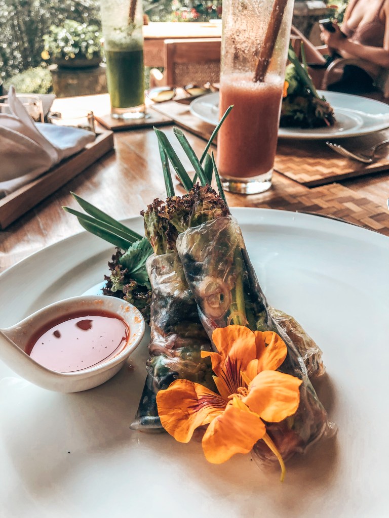 Das Sacred Rice ist mit Abstand mein heimlicher Favorit. Auch hier empfiehlt es sich einen Tisch zu reservieren, am besten einen, der zu den kleinen Reisfeldern gerichtet ist. Man sitzt also nebeneinander (was wir ohnehin viel lieber tun) und schaut auf den wunderschönen eignen Garten des Restaurants. Alle Gerichte werden mit frischen Zutaten aus dem Garten zubereitet und schön drapiert. Die ganze Atmosphäre war so unglaublich gemütlich, dass ich eine Gänsehaut hatte. Wenn ihr in Ubud seid, genießt hier einen romantischen Abend zu zweit.
